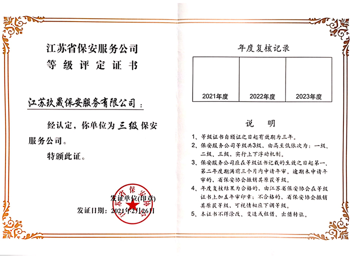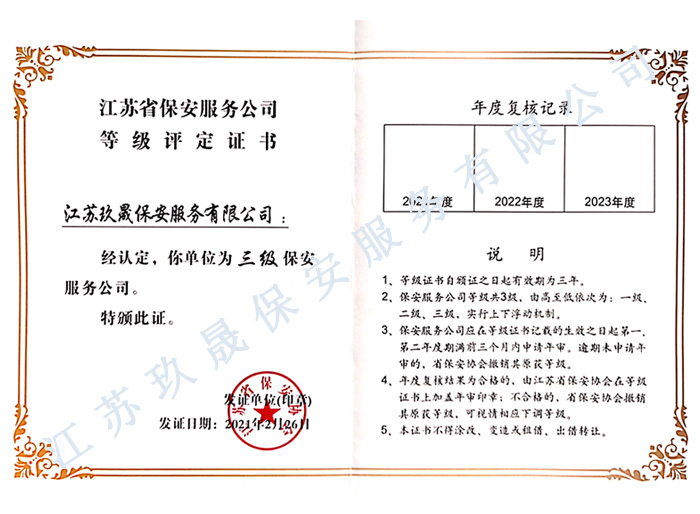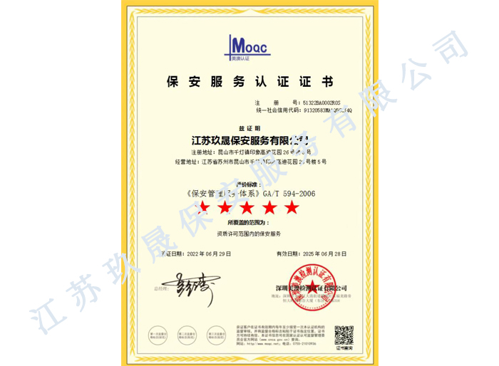 江蘇玖晟保安服務(wù)有限公司位于昆山市千燈鎮(zhèn)。注冊(cè)資金:5000萬(wàn),擁有省公安廳頒發(fā)的保安服務(wù)許可證的企業(yè),是昆山市保安協(xié)會(huì)常務(wù)理事單位。