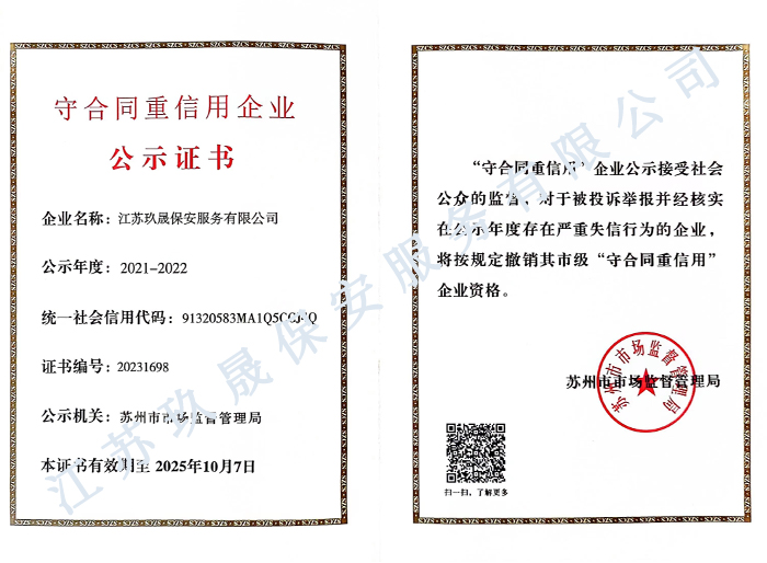 • 我們轉(zhuǎn)運(yùn)中心自從換了玖晟保安,發(fā)現(xiàn)安全問(wèn)題及時(shí),處理事故效率高,服務(wù)態(tài)度也比之前的保安熱情多了。 ---南通申***8 2023-08-10